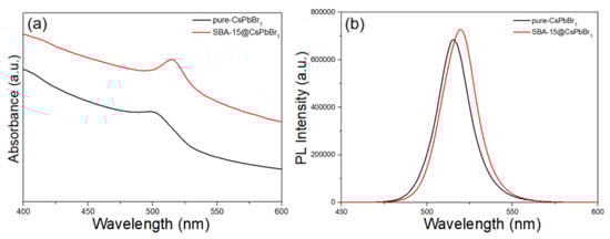 (a) UV-Vis absorption of pure CsPbBr3 QDs (black) and SBA-15@CsPbBr3 QDs (red); (b) PL spectra of pure CsPbBr3 QDs (black) and SBA-15@CsPbBr3 QDs (red).