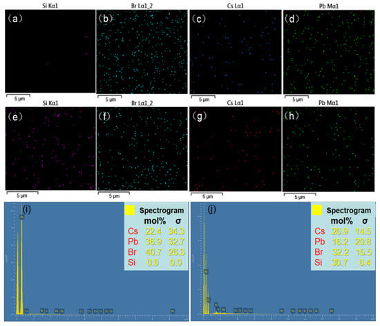 The TEM photographs were shown in Figure 2a,b, which indicate the particle sizes of CsPbBr3 QDs and SBA-15@CsPbBr3 QDs which were 3 and 6 nm, respectively. The size and distribution of CsPbBr3 QDs and SBA-15@CsPbBr3 QDs were shown in Figure 2c,d. In Figure 3, the energy-dispersive spectroscopy (EDS) elemental mapping of the CsPbBr3 QDs and SBA-15@CsPbBr3 QDs films are shown. As shown in Figure 3i,j, from which a distribution of Si elements in the selected square area was clearly seen, the EDS peak of Si has been observed in SBA-15@CsPbBr3 QDs. The mole fraction of each element in CsPbBr3 QDs and SBA-15@CsPbBr3 QDs was shown in Table 1. The mole fraction of Si was 0 in CsPbBr3 QDs and 30.7 in SBA-15@CsPbBr3 QDs.