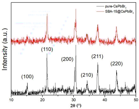 XRD pattern of pure CsPbBr3 QDs (black) and SBA-15@CsPbBr3 QDs (red).