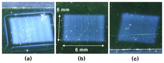 Haze on the specimen surface that remained after five times repeated etching of a 6 mm by 6 mm raster scan etch by the mixed gas filament plasma of He 2 slm and NF3 (a) 0.5 sccm, (b) 1 sccm and (c) 2 sccm. (Va: 1 mm/s).