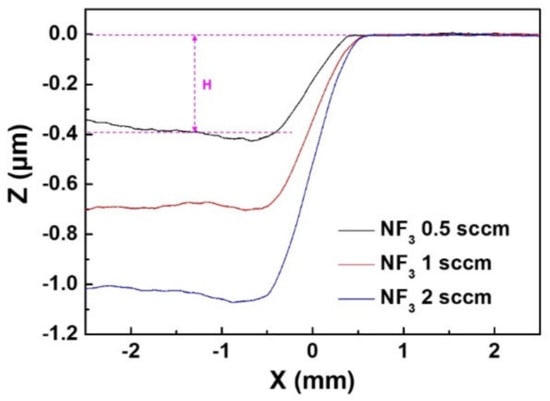 From the results in Table 1 and Figure 3, H and Area increased as the amount of NF3 mixing increased, but there was no significant change in FWHM. The size of the FWHM and the shape of the etch profile will be greatly affected by the size and plasma particle distribution of the plasma disc formed on the specimen surface, and the H and Area are related to the concentration of etching agent in the plasma disc. Hence, when the plasma generating electrode and the applied voltage were given, the increase in NF3 mixing amount in the range of 0.5–2 sccm into 2 slm of He does not change the size of the plasma disc and the plasma particle distribution much, while the concentration of the etching radical increases resulting in an increase in the etching amount.