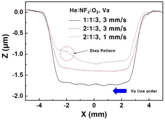 The bottom profile of the specimen of He:NF3:O2 1:1:3 of reduced He amount with Va 3 mm/s in Figure 8 shows the wave pattern. In this filament plasma, the NF3 concentration was the highest; hence, the etch depth was deepest. However, due to the lower nozzle jet velocity, external air is diffused into the filament plasma area, which increases the filament plasma sustaining voltage. The change in the filament-sustaining voltage influences the output voltage of the power supply, which actively control the output power to keep the setting power of 100 W. It forms a waved bottom profile.