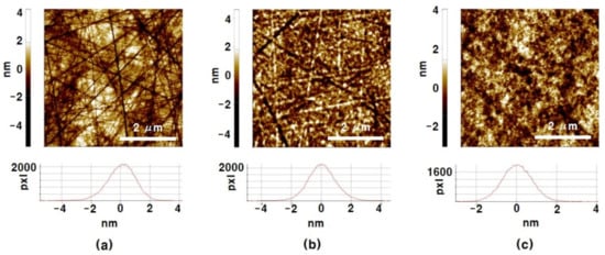 The surface roughness of the specimens etched with Va at 3 mm/s and the process gas with He:NF3:O2 1:1:3 and 2:1:3 in Figure 8 were measured precisely by AFM, and the results are represented in Figure 9. Figure 9a is the AFM result of a primitive SiC wafer. A large amount of tool scratches remained in the final polishing process when the specimen manufacturer produced the wafer were observed. The measured surface roughness of the pristine SiC wafer specimen was Ra 0.749 nm. The etch depth of the 6 mm by 6 mm etched area by He:NF3:O2 1:1:3 filament plasma for 30 min was 1.72 μm. The AFM result of this specimen is shown in Figure 9b. The scratches on the surface of the SiC specimen shown in the pristine specimen were slightly removed, and the Ra was also slightly reduced to 0.732 nm. The process conditions that showed the best haze suppression and profile stability in the results of Figure 7 and Figure 8 were He:NF3:O2 2:1:3 with Va 3 mm/s. The etch depth of the specimen etched by this optimized process condition for 30 min was 1.37 μm. Although the etch rate was slightly lower than by the He:NF3:O2 1:1:3 filament plasma, as shown in Figure 9c, the tool scratches shown on the pristine wafer were completely removed, and the measured roughness was Ra 0.587 nm, which was rather smoother than the pristine.