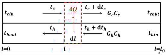 A simplified schematic diagram of a counterflow heat exchanger is shown in Figure 1. The real heat exchange process is very complex, where the physical parameters of the working fluids have non-linear relations with temperature, which varies in the different parts of every cross-section, and so on. It is impossible to obtain a purely mathematical solution to a real heat exchange process. In this paper, some conditions are simplified as follows: