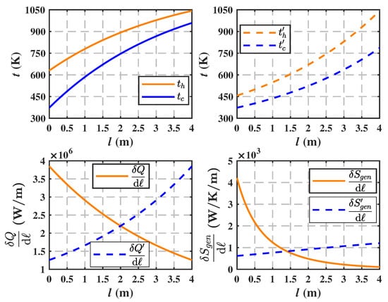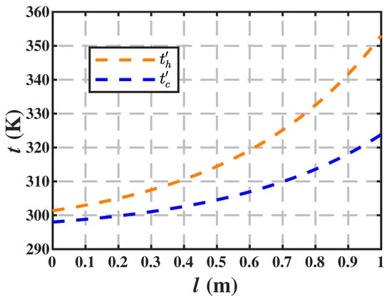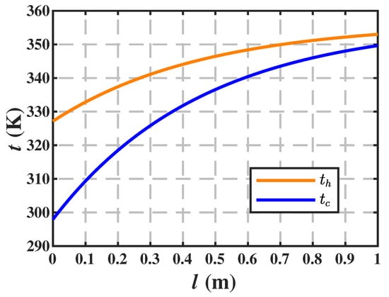 We keep all other parameters of the CFHX the same as before, such as the convection heat transfer coefficient and inlet temperatures; only the heat capacity flow rates of the two streams are exchanged with each other. The temperatures of the hot and cold streams are functions of ℓ, which can be expressed as: