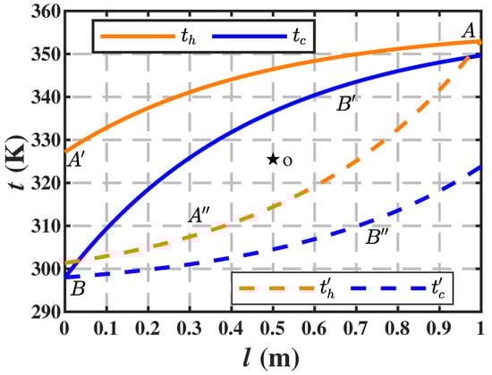 To clarify this feature, the curves are compared in Figure 5. The inlet temperatures of the hot and cold streams are marked as A and B, respectively. Equation (13) reveals that curves and are rotationally symmetrical around the midpoint of , which is marked as o. Meanwhile, curves and have similar symmetry. The total amount of heat transferred in the CFHX is the product of and the area enclosed by the high and low temperature curves; hence, the two pairs of heat capacity rates result in the same total heat exchanged.