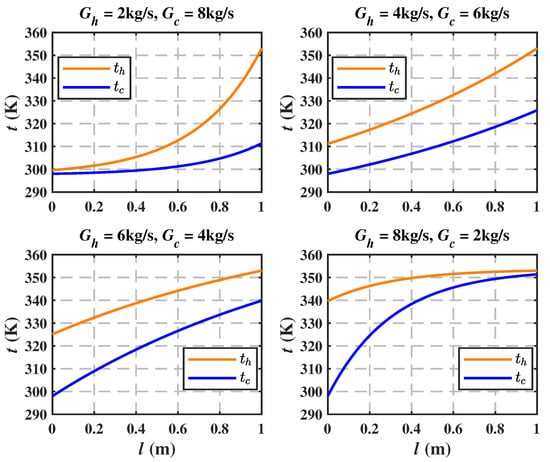 This means that the temperature difference at ℓ in the CFHX with stream parameters, and is the same as the temperature difference at , where the stream parameters are and . In order to clarify the conclusion, a CFHX with the parameter values in Table 1 is analyzed again after the mass flow rates are exchanged with each other as shown in Table 2.