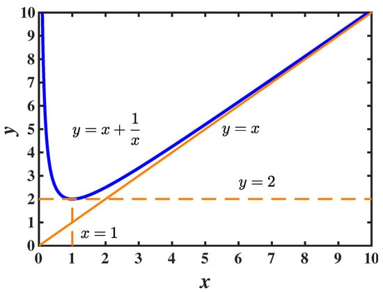 An image of the above hook function is shown in Figure 11. The lines, and , are two asymptotes of the hook function. When x belongs to interval , is a decreasing function; it increases with x when the independent variable is larger than 1.