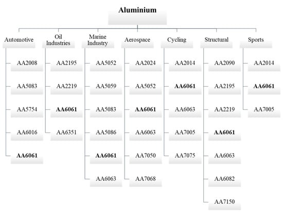 Aluminum and alloys are among the top non-ferrous metals used in numerous engineering applications []. The Aluminum Association (AA) is the coordinating body for aluminum and alloys. The association is in collaboration with aluminum product manufacturers assign different grades to Al and its alloys. Figure 1 shows different AA grades used in different industries. AA6061 is one of the most popular and common AA grades used in various applications ranging from aerospace, marine, to automobile industries. AA6061 consists of magnesium (Mg) and silicon (Si), which are precipitated in the Al matrix []. The addition of copper (Cu) or zinc (Zn) improves the strength of the alloy, while Si gives rise to brittle nature in the alloy. Mechanical properties of Al-based alloys are dependent on the manufacturing, heat treatments, and the composition of alloying elements such as Si, Cu, and Mg. The chemical constituent of aluminum alloy is shown in Table 3 and Table 4 [,].