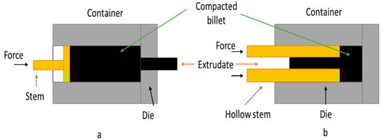 Extruding complex geometries must be handled with extreme care because of the grain distortion affecting the final geometry [,,]. In the hot extrusion process, the billets are reported to be transformed through compaction into extrudate. Either the direct or indirect hot extrusion method could be used for extrusion. Each method differs in properties and the area of application for the final products. Figure 3 explains the difference between both extrusion processes. Mostly, the direct hot extrusion method is used because of the higher compression in direct extrusion [].