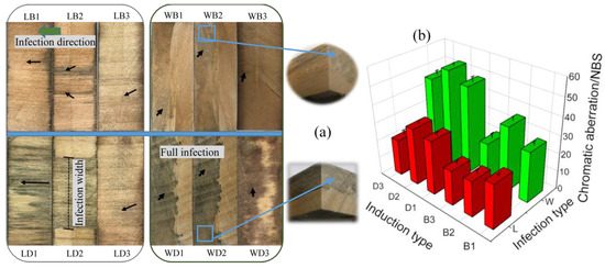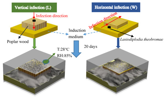 To test the difference of infection effect of Lasiodiplodia theobromae in vertical and horizontal directions of poplar cross-section, the direction of wood specimen was set in a cross-section upward (Vertical infection, L) and a cross-section towards the sides (Horizontal infection, W), without edge sealing treatment. However, half of the thickness of the horizontally infected wood specimen was below the nutrient substrate level to verify that fungi would not grow from the bottom of the specimen. The inoculation position of the vertical infection was on the cross-section surface, while the horizontal infection position was on the culture medium to ensure vertical and horizontal infection effectiveness. As shown in the infection diagram in Figure 1, the basic culture medium was PDA, and either a tyrosinase or a tricyclazole inducer was added to make induction medium ((1) control, (2) tyrosinase, and (3) tricyclazole). The specimens were cultured in a humidity box with a constant temperature of 28 °C and relative air humidity of 85% for 10 (A), 20 (B), 30 (C), and 40 (D) days. After dyeing, the dyed wood was sterilized by a pressure steam sterilizer (pressure 0.111 MPa, temperature 121 °C). After sterilization, the mycelium on the surface of the wood was removed and dried in a constant temperature drying oven at 40 °C to a moisture content of 8%–12%.