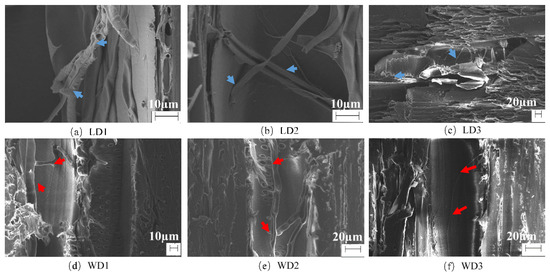 Micromorphology of vertical (a–c) and horizontal dyeing (d–f) of poplar wood by Lasiodiplodia theobromae after 40 days. (The arrow indicates the position of mycelium).