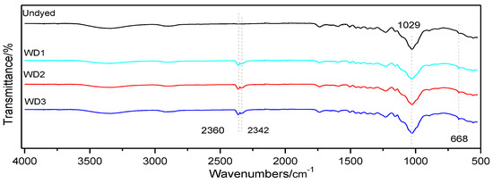 The growth of hyphae is accompanied by the secretion of cell wall degrading enzymes, such as cellulase (Cx), hemicellulase, and ligninase, which consume the cell wall components and destroy the wood structure. This experiment explored the changes in the composition and structure of dyed poplar wood and selected the horizontal infection method with a better infection effect to test the dyed poplar wood (Figure 6). The infrared spectrum showed that there are 2342 and 2360 cm−1 characteristic peaks in the dyed wood, which should be the main structural substance of the pigment secreted by fungi, and it was speculated that this substance was the stretching vibration of the C−C triple bond [42]. In addition, there were characteristic peaks of 1029 cm−1 (aromatic C−C structure or the stretching vibrations of C−O−C) and 668 cm−1 in-plane C-H bending deformation and out-of-plane C−H deformation [43], and the intensity of these peaks increased. In general, the infrared analysis of chemical components of dyed wood did not show the characteristic peak which disappeared or weakened obviously, so it was speculated that it had little effect on the composition and structural strength of wood.