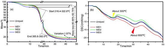 Calculation of crystallinity based on X-ray diffraction pattern [44] (Segal): X-ray crystallinity (XC) = (I002 − Iam)/I002 × 100%, of which I002 is 002 (22.0°) of the diffraction intensity of the crystal plane, Iam (18.0°) is the diffraction intensity of the amorphous region. The crystallinity was 38.17%, 33.52%, 33.29%, and 34.82%, respectively, from the control group to the tricyclazole induced group (Undyed, WD1, WD2, WD3). The crystallinity of the infected wood was similar but slightly decreased (Figure 7), indicating that the growth and secretion of fungi in the wood had a certain effect on the cellulose crystallization area. TG test showed that the gap value of the weight loss rate of each group was 1.87%, and the biggest weight loss rate was the untreated group (Figure 8a). DSC test showed that two exothermic peaks appeared at 300 °C and 600 °C and had a slight difference in the endothermic peak area (Figure 8b). This should be due to the influence of pigment secreted by fungi or the individual differences.