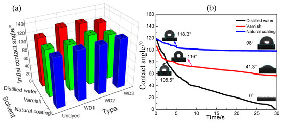 The contact angle test was carried out by selecting the poplar wood with a better dyeing effect. As shown in Figure 9, the initial contact angle of horizontal dyed wood in distilled water increases obviously compared with other groups, but the initial contact angle of varnish and natural coating on dyed wood was almost the same as that of untreated wood. The reason was that varnish and natural coating both have a relatively high viscosity and molecular weight. The two liquids had a large wood contact angle in normal conditions, and the partial mycelium from dyed wood was filled with the channel for the solvent to pour into the interior. Therefore, the transmission channel of water molecules was narrowed compared with untreated wood, which was more obvious compared with other solvents. Figure 9b shows the typical dynamic curves of three solvents in wood. The higher the molecular weight and viscosity, the smaller the change rate of the contact angle.