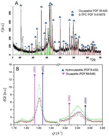Unequivocal detection of OAp by conventional X-ray diffraction is difficult [34,35] since its c-axis dimension is only marginally larger than that of HAp [35,36,37]. This results in only a small shift of the (00.2) interplanar spacing towards smaller diffraction angles. Consequently, very accurate measurements are needed as provided by single crystal diffraction using high-resolution synchrotron radiation or neutron diffraction. The lattice expansion during dehydration shown in Figure 3B is likely effected by the larger Shannon crystal radius of the O2− ion (135 pm) compared to that of the OH− ion (118 pm).