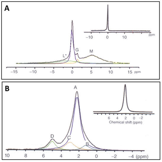 Figure 6A,B show 1H-MAS and 31P-MAS NMP spectra of as-sprayed hydroxylapatite coatings [22]. Whereas highly crystalline, stoichiometric HAp is characterized by a single proton position at −0.1 ± 0.1 ppm (Figure 6A, inset, band L), HAp exposed to the high-temperature plasma jet shows additional band positions at −1.3 ± 0.3 ppm (band L*) as well as 5.2 ± 0.3 ppm (band M), whereby the isotropically shifted band L* is associated with protons in distorted short range-ordered (SRO) structures of thermally stressed HAp, and band M is attributed to isolated pairs of strongly coupled protons in the channels parallel the c-axis [52]. The band G at 1.3 ppm belongs to mobile free water molecules.