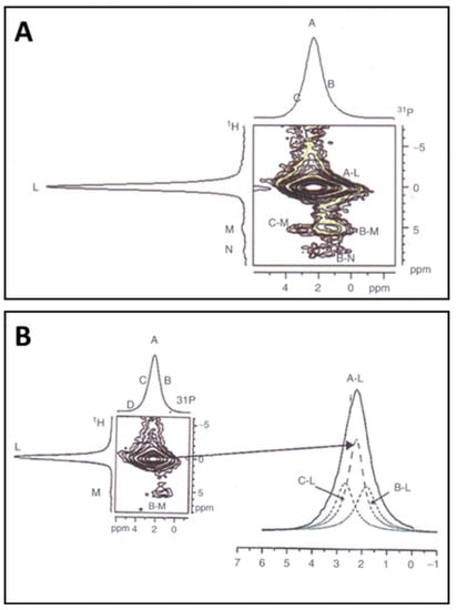 (A): 2D-1H/31P-CP-HETCOR NMR spectrum of a plasma-sprayed HAp coating [53,54]. Band assignments according to Ref. [21]. (B): 2D-1H/31P-CP-HETCOR NMR spectrum of a plasma-sprayed HAp coating incubated for 12 weeks in simulated body fluid [55]. The cross-section of the HETCOR spectrum at the proton frequency of band L shows reduction and disappearance, respectively, of the HETCOR signals C-M, B-M, and B-N [54]. © Reprinted with permission from R.B. Heimann and H.D. Lehmann, Biomedical Coatings for Medical Implants (Wiley-VCH, Weinheim, 2015). Copyright 2015 Wiley.