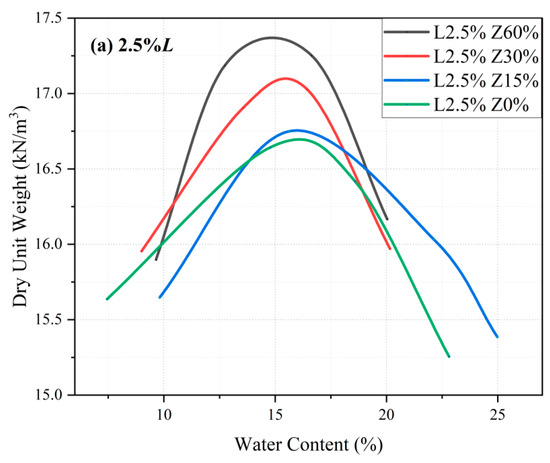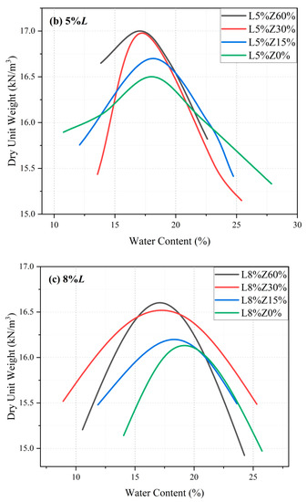 Variation of dry unit weight with water content for various zeolite replacement percentages (Z%) for the samples stabilized with (a) 2.5%, (b) 5%, and (c) 8% lime content.