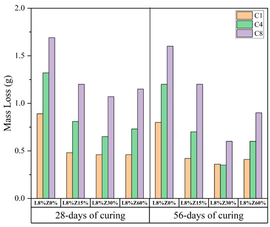 Figure 5 gives a summary of the results from the durability assessment for the specimens containing L = 8% and different zeolite content replacements under 1, 4 and 8 cycles of freezing and thawing. It is noticed that for a given Fr-Th cycle, the increase of L(%) in the lime-stabilized specimens led to a reduction in the amount of mass loss which agrees with reported data in the literature [105]. In addition, at a given lime content and zeolite replacement, increasing number of Fr-Th cycles triggered an increase in the maximum volume change of the lime-stabilized soil mixtures. More interestingly, the partial replacement of the lime with zeolite in the mixtures, up to the optimum content (Z = 30%), could also be observed to cause a reduction in the overall mass loss leading to enhanced durability.