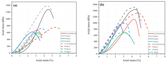 As can be seen in this figure, for the samples without zeolite, as L(%) increases, the peak stress (unconfined strength) increases; while the axial strain at which failure occurs decreases, thus resulting in a more brittle behavior. Even for a smaller amount of lime inclusion (L = 2.5%), a significant increase of the UCS strength of, approximately, 6–7 times could be observed compared with the untreated soil. An increase of L(%) from 2.5% to 8% and also the duration of time the samples were allowed to cure from seven to twenty-eight days resulted in the enhancement of the UCS strength (increase of around four times), while the axial strain at failure dropped from 6.5% to 2.5%, approximately (Figure 3a). Similarly, for the specimens with a given lime content and at a particular curing time, as the zeolite content (Z%) in the mixture increased up to 30% of replacement, the peak stress increased and the failure strain decreased, showing again more brittle behavior. However, an opposite trend could be observed for the mixtures with the Z(%) beyond 30 percent where the UCS values dropped significantly. The data also suggest that all the specimens show a more brittle behavior with increasing curing period from 7 to 56 days. Additionally, for lower contents of lime (and lime/zeolite additives) or shorter curing periods, the curves have a softer response at their initial regime, which is commonly observed in UCS tests of untreated and/or cemented soils, giving rise to an “S” shape of the curves [58,76,77]. This shape resulted from the UCS tests is also observed for both “engineering rock” and “engineering soil” types of materials [102].