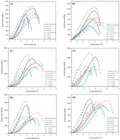 Stress–strain response of (a) stabilized clay specimens with various percentages of lime without zeolite, (b) stabilized clay specimens with 2.5% lime and various percentages of zeolite, (c) stabilized clay specimens with 5% lime and various percentages of zeolite and (d) stabilized clay specimens with 8% lime and various percentages of zeolite cured for 7, 28 and 56 days.