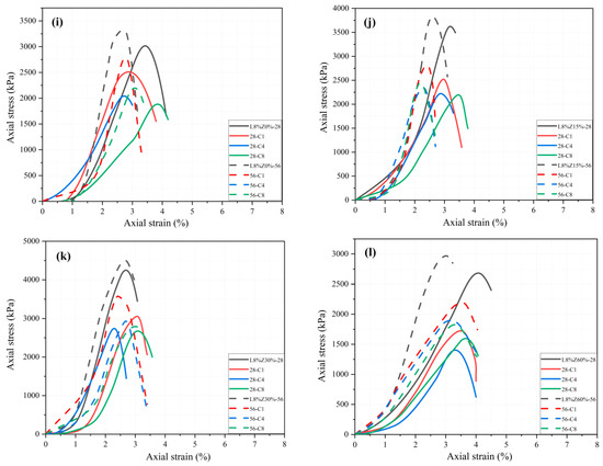 Stress–strain response of (a) L2.5Z0, (b) L2.5Z15, (c) L2.5Z30, (d) L2.5Z60, (e) L5Z0, (f)L5Z15, (g) L5Z30, (h) L5Z60, (i) L8Z0, (j) L8Z15, (k) L8Z30 and (l) L8Z60 specimens cured for 28 and 56 days and the effect of freezing–thawing.