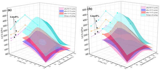 The influence of lime and zeolite partial replacement on the strength (UCS) of the composite specimens cured for twenty-eight and fifty-six days at different numbers of freeze–thaw cycles is illustrated in Figure 7. Based on this figure, the increase of Fr-Th cycles leads to a decrease of the UCS values. The UCS values of the natural (untreated) soil are observed to be quite low compared with the composite (treated) specimens. After a few freeze–thaw cycles, the original (untreated) soil had practically no resistance to shearing, which signifies the very negative influence of the freezing–thawing process on the mechanical response of silt-sized soils, which is perhaps contributed by the cryosuction process, as discussed in Section 2, leading to the magnification of the disintegration of the soil. It can be noticed that the specimens containing L = 8% and Z = 30% rendered the greatest amount of strength against successive freeze–thaw cycles. Thus, lime treatment reduced the detrimental effects of Fr-Th cycles and with the addition of zeolite (up to 30%), better outcomes were acquired. These results are exacerbated in the 56 days of curing due to the continuation of pozzolanic reactions.