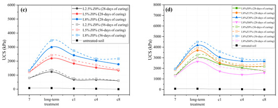 Variation of unconfined compressive strength (UCS) with lime content and zeolite partial replacement for the samples cured for (a) 28 and (b) 56 days subjected different numbers of freeze–thaw cycles; variation of strength (UCS) with time for (c) samples with various lime contents without zeolite partial replacement and (d) samples with 8% lime content and different zeolite partial replacements; cured for 28 and 56 days subjected different numbers of freeze–thaw cycles.