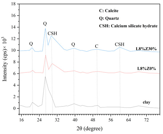 XRD patterns for the clay, L8%Z0%, and L8%Z30% samples after 56 days of treatment.