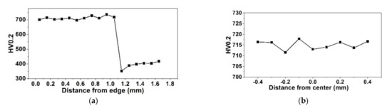 The hardness distribution along the center line of Figure 1b shows that the hardness of the hardening layer reached 695–734 HV0.2, which is 1.6 times higher than that of the base material (Figure 2a). The thickness of the hardening zone reached 1.05 mm. This implies that the laser hardening was obvious. In addition, the hardness near the substrate was slightly higher than that near the surface. The uniformity distribution of the hardness is shown in Figure 2b. The hardness at 0.6 mm from the surface was 713 ± 4 HV0.2, which demonstrates good uniformity.