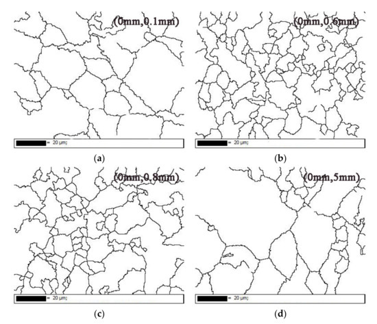 Grain boundary map of primary austenite at (a) 0.1 mm, (b) 0.6 mm, (c) 0.8 mm, and (d) 5 mm from the surface.