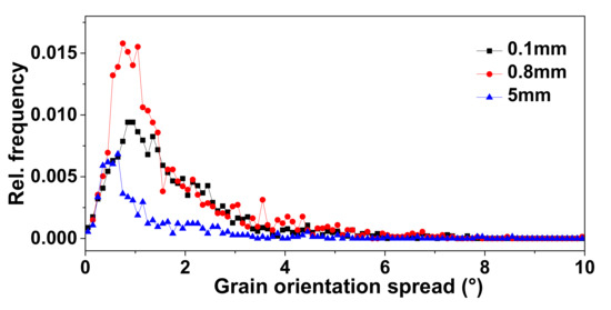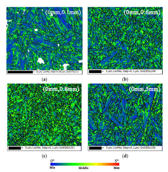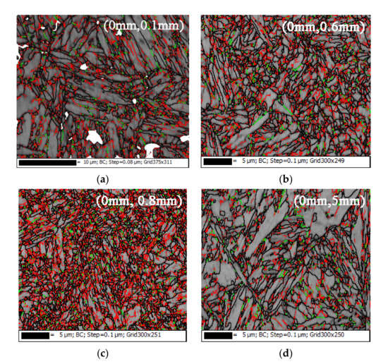 Based on the EBSD detection, the difference between the martensite in the hardening zone and in the substrate was analyzed. Figure 6 and Figure 7 show the distribution of martensite grain boundaries from the surface to the substrate. Compared to the substrate, there were more low-angle grain boundaries in the hardening zone, especially the 2°–5° grain boundaries marked by the red line (Figure 6). The small-angle grain boundaries contributed to the improvement of hardness at the surface zone, especially at 0.6 and 0.8 mm.