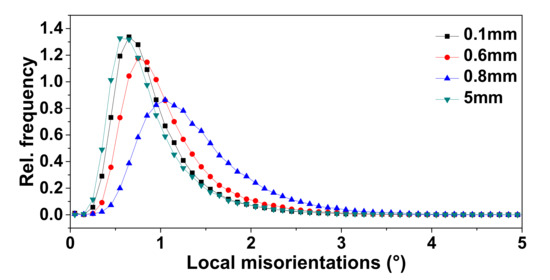 Misorientation distribution of martensite at 0.1, 0.6, 0.8, and 5 mm from the surface.