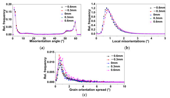 Distribution of (a) misorientation, (b) KAM, and (c) GOS at different positions from the surface of 0.6 mm.