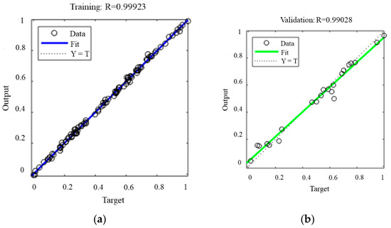where yi is the expected value of the ith output neuron; oi is the predictive value; is the average of expected values; and q is the number of plans. An R value close to 1 indicates a high degree of coincidence between the origin and the fitting line of the predicted data and a good fitting effect.