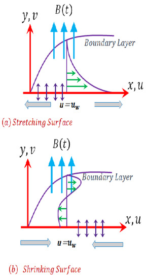 Let us consider the 2D boundary layer flow of magneto-Carreau fluid near a stagnation point driven by a permeable stretching/shrinking sheet, as shown in Figure 1. The effects of viscous and Joule dissipation, as well as a non-uniform heat source/sink, are considered in the energy equation. It is presumed that the velocity of shrinking/stretching is u w = λ u w , while λ is a constant which represents the stretching or shrinking surface. The stretching of the stretching/shrinking sheet is vertical to the y-axis. The velocity of the shrinking sheet is u w = λ u w , where λ is a constant with (0 < λ > 0), referring to the stretched/shrunk surface, respectively, and u e (x, t) is the stagnation point velocity. It is presumed that T w , T , v w (x, t), and B 0 represent the surface temperature, ambient temperature of fluid, mass transport velocity, and transverse magnetic field, respectively.