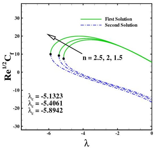 Figure 2. Influence of Re−1/2 Cf with λ for various values of n and β = We = 0.3, S = 5, M = Ec = 0.5, A = B = 0.1, and Pr = 3.