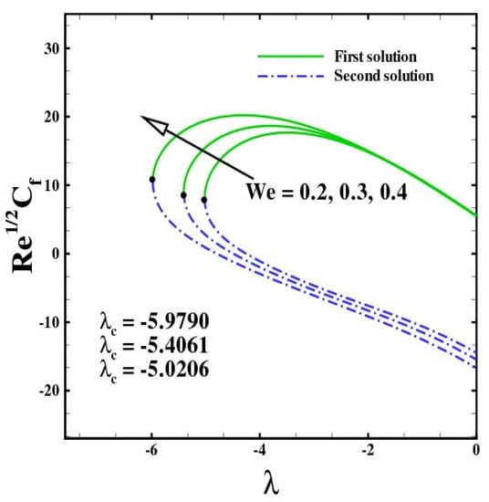 The simulation results of Equations (7) and (8) conducted at the boundary condition (9) were analyzed for numerous values of the pertinent parameters β ,   W e ,   S ,   n ,   A ,   P r ,   B ,   M , E c , and λ and the developmental condition in which the dual (first and second branch) solution can occur in the unsteady flow across a shrunk surface. In Figure 2, dual nature of solutions are observed for local skin friction R e 1 / 2 C f for distinct values of n . The values n = 2.5 ,   2 ,   1.5 represent the shear thickening behavior of Carreau fluid found in dispersions of highly condensed colloid particles. Its viscosity increases the shear loading, making it useful in protective and impact resistance applications. As the critical values of λ changes from λ c = ( 5.1323 , 5.4061 , 5.942 ) , it is observed that surface drag force increases for first solution and opposite pattern is seen for second solution for higher values of n . Figure 3 displays the impact of R e 1 / 2 C f with λ for S when the dual solution λ c < λ < 0 , where critical values of λ are λ c = ( 4.5731 , 4.9906 , 5.4061 ) . From Figure 3, it can be illustrated that first solution is significantly increasing, whereas second solution diminishes for the higher values of S . Similar phenomena are noted, although we examined Figure 4, with Figure 3 for W e . The influence of R e 1 / 2 N u compared to λ for various values of P r is described in Figure 5. In this figure, we have computed that the λ c is 4.99 . In the heat transfer mechanism, the Prandtl number controls the relative thickness of the momentum and thermal boundary layers. It is noticed that when the values of P r are small, the heat diffuses quickly in the case of the second solution. Thus, the heat transfer rate at the surface enhances with higher values of P r in the case of the first solution. As can be shown in Figure 6 for both solutions, the rising E c results are reduced in the heat transport rate R e 1 / 2 N u . Further, the Eckert number indicates if the transition of momentum energy to heat energy has a major impact on the fluid flow and heat transfer. Therefore, higher values of E c reduce the heat transfer rate for both solutions. The variation of velocity profile f   ( η ) for different values of β is revealed in Figure 7. From this Figure, it is noted that the velocity profile reduces for both branches for improving the values of β . The impact of M on velocity profile f   ( η ) is distributed in Figure 8. From this plot, it is stated that higher values of M reduces the velocity profile. This is due to the fact that M provides the Lorentz force, which slows down the movement of fluid, thereby decaying the thickness of the boundary layer. Figure 9 illustrates that the temperature of the non-dimensional characteristic, thus the rate of heat transport, also improves for the first branch and decays for the second branch with the enhancement of B . On the other hand, an inverse behavior of A on the heat transport is detected, as can be noticed from Figure 10. The variation in θ ( η ) is displayed in Figure 11 and Figure 12 for higher values of β and M . These figures illustrate that the heat transport improves for both branches for large values of β and M . These outcomes are well developed and have not been replicated here, for simplicity.