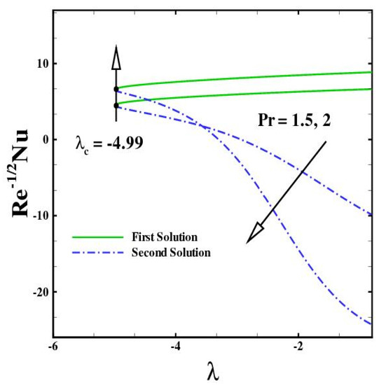 Figure 5. Impact of Re−1/2 Nu with λ for various values of Pr and n = 2, S = 4.5, We = β = 0.3, M = 0.5, and A = B = Ec = 0.01.
