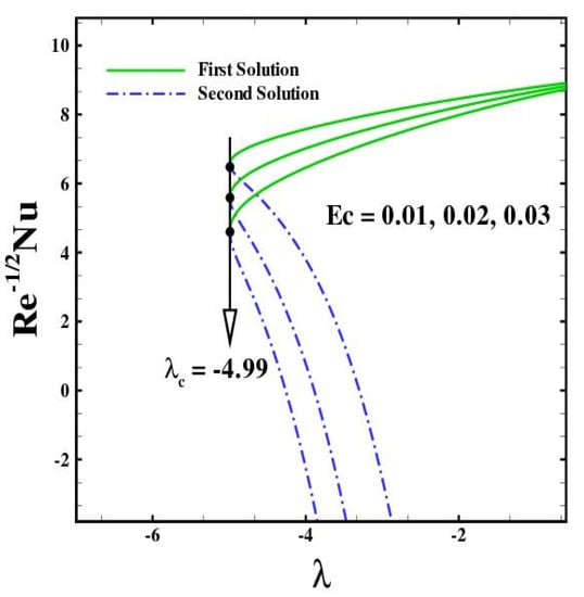 Figure 6. Impact of Re−1/2 Nu with λ for various values of Ec and n = Pr = 2, S = 4.5, We = β = 0.3, M = 0.5, and A = B = 0.01.
