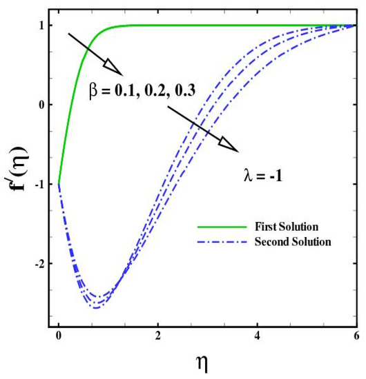 Figure 7. Impact of f′(η) with several values of β and We = 0.3, n = 2, M = Ec = 0.5, Pr = 3, S = 4, and A = B = 0.1.