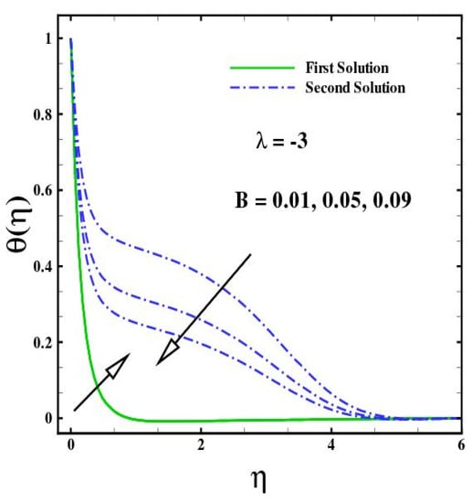 Figure 9. Influence of temperature with different values of B and M = 0.1, We = β = 0.3, S = 4, Ec = A = 0.01, and Pr = n = 2.