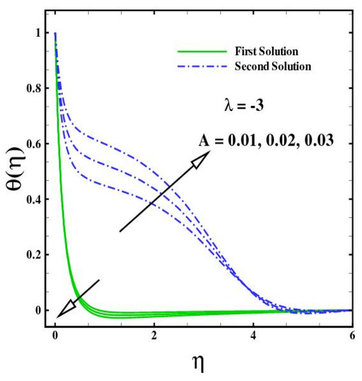 Figure 10. Effect of temperature with several values of A and We = β = 0.3, M = 0.1, S = 4, Ec = B = 0.01, and Pr = n = 2.