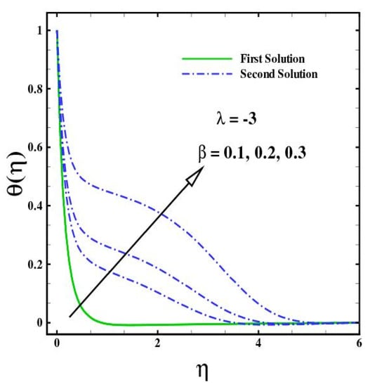 Figure 11. Influence of temperature with different values of β and M = 0.1, We = 0.3, S = 4, Ec = A = B = 0.01, and Pr = n = 2.