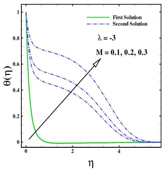 Figure 12. Impact of temperature with several values of M and We = β = 0.3, S = 4, Ec = A = B = 0.01, and Pr = n = 2.