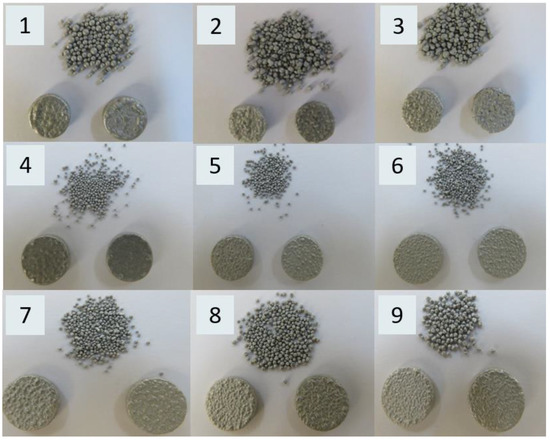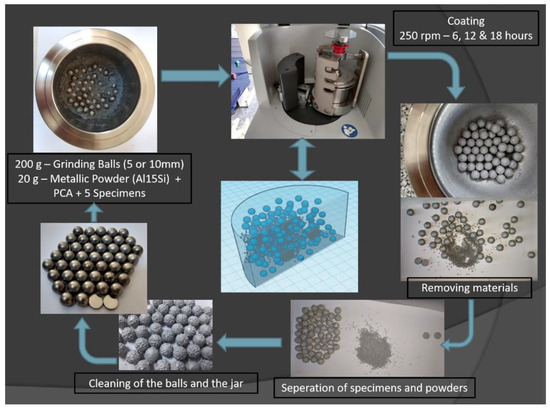 For mechanical milling operations, a planetary ball mill device (Retsch PM 100, Hahn, Germany) with a standard 500 mL hardened steel grinding jar and 200 g of grinding balls (Retsch, Hahn, Germany; 58 to 63 HRC hardness) were used. Grinding balls with different diameters (5 and 10) were selected in order to understand the effects of ball size on the homogeneity of the coating layer. Powder to ball ratio was specified as 1/10 (20 g of metal powder), different PCA ratios, and milling times were selected to examine the effect of these parameters (Table 2). The milling processes were performed in ambient conditions with a milling speed of 250 rpm. In order to avoid the rise in temperature during the coating process, 5 min of coating application was followed by 5 min of cooling of the vial (see Figure 1).