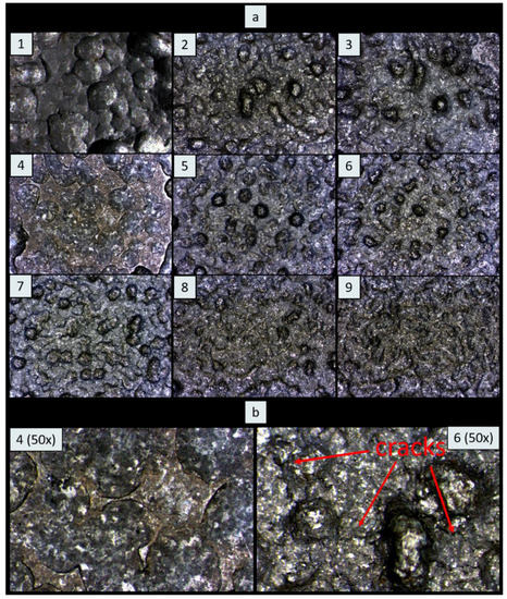 Stereographic structures of coatings (a) (16× magnification), and (b) showing coatings number 4, and 6 (50× magnification).