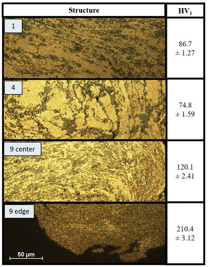 HV1 hardness values for specimens numbered 1, 4, and 9; with different structures.