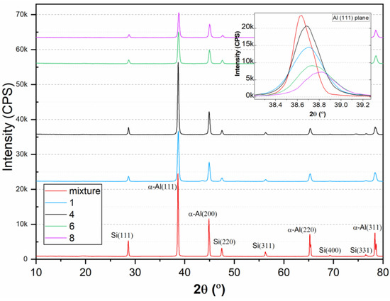 Figure 7 shows the XRD phase development of produced alloy coatings with the starting powder mixture. Because of their nature, Al-Si hypereutectic alloys do not form an intermetallic compound after forming an alloy via mechanical alloying; α-Al solid solution and Si diffraction peaks remain separate. Still, peak heights and widths changed after MA was applied via increasing silicon content in the α-Al matrix. Moreover, increasing time and PCA amount, decreased the crystallinity of MA-alloyed coatings.